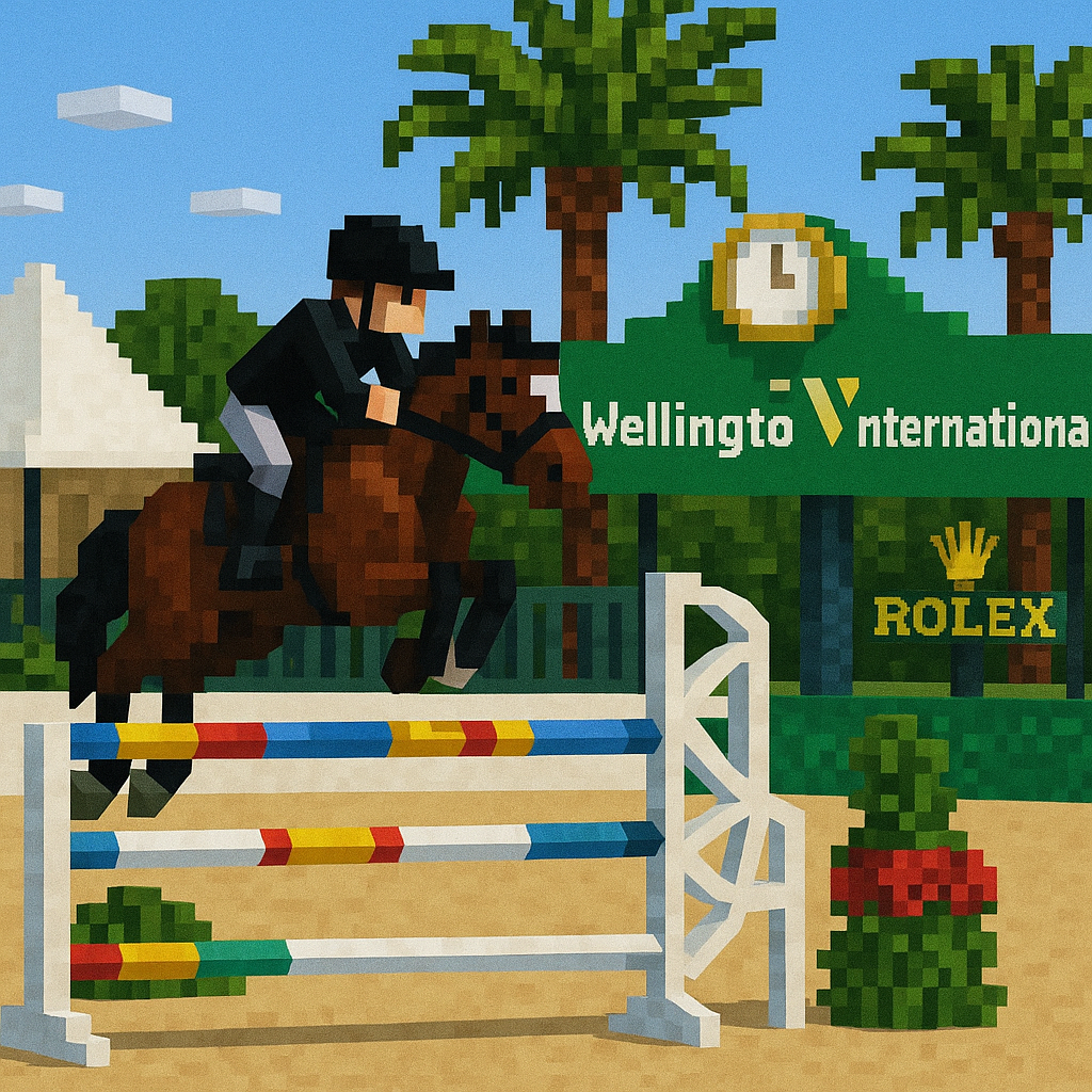 This global equestrian hub hosts the world-famous Winter Equestrian Festival. Think Olympic-level riders, top-tier horses, and a community that lives and breathes sport. Now imagine that as a scene built from cubes, complete with a green archway, a Rolex-branded scoreboard, and pixel ponies mid-jump.