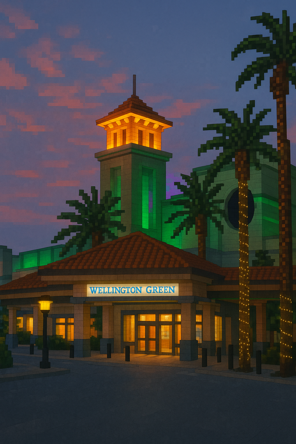 Imagine stepping into Wellington, Florida — not as it is in everyday life, but as a Minecraft-style dream world. Palm trees made of green cubes, horses leaping across rainbow-colored jumps, and community events staged on grassy pixel platforms.